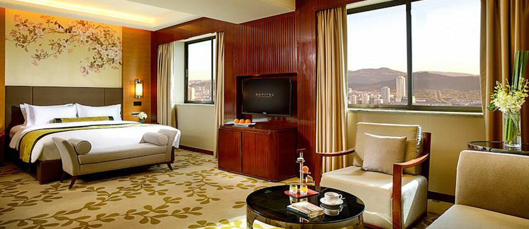 济南索菲特银座大饭店豪华客房,分为双床房和单床房;温馨高雅的城市景观房,38平方米,拥有融合中式元素的时尚风格设计,配备索菲特MyBed特大床、液晶电视、迷你酒吧、免费无线网络和宽带上网以及保险箱。